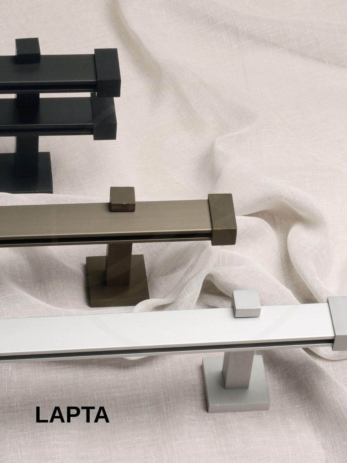 LAPTA, keskin hatları ve sade geometrik formuyla öne çıkan, modern mimari çizgilere sahip dekoratif perde rayı sistemidir. Kare formdaki gövde ve ayak yapısı sayesinde mekânda güçlü ve net bir duruş sergiler.